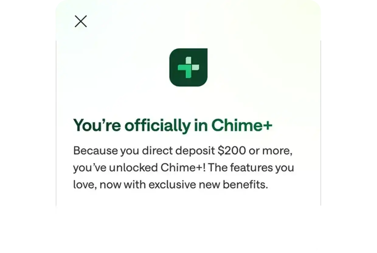 To get Chime+, you need to receive a qualifying direct deposit of $200 or more within the preceding 34 days.> Once your deposit is processed, your Chime+ status will activate automatically.