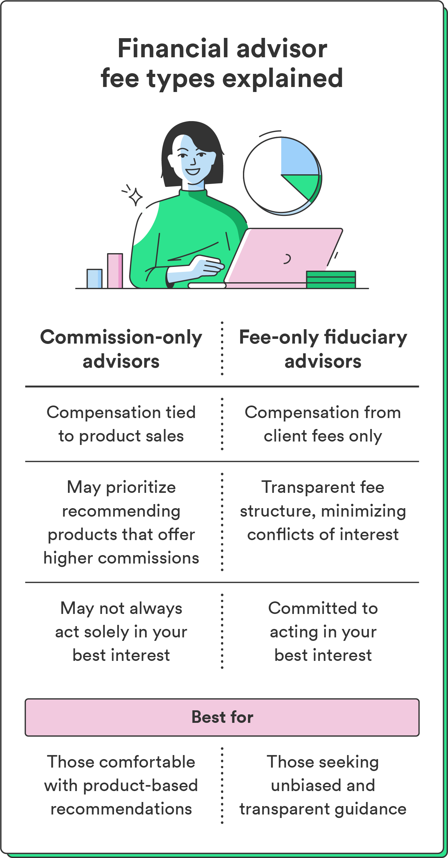 Advisors who don’t follow a fiduciary standard may have other motivations, like earning commissions from financial products they recommend. These are called commission-based financial advisors, whose recommendations are not required to be in your best interest. They might favor products like investment funds or insurance policies that benefit them financially.