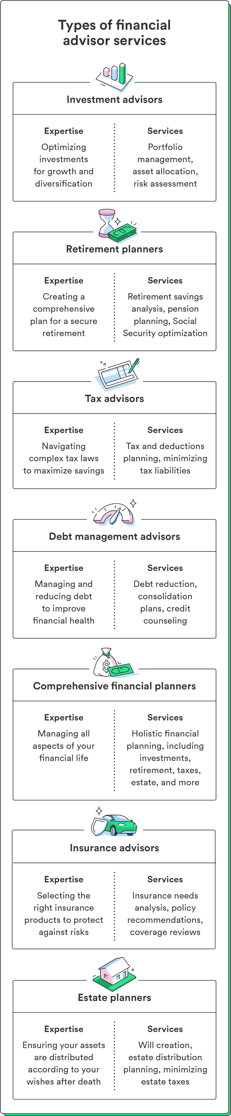 - Insurance planning: Advisors can help you choose the right insurance products and level of coverage that fit your needs.