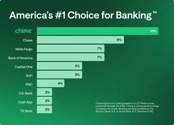 • A recent study from J.D. Power, a consumer intelligence and data analytics company, found that 13% of new checking accounts opened in the third quarter of 2025 were with Chime. That’s more than any other bank provider, including Chase (9%), Wells Fargo (7%), and Bank of America (7%).