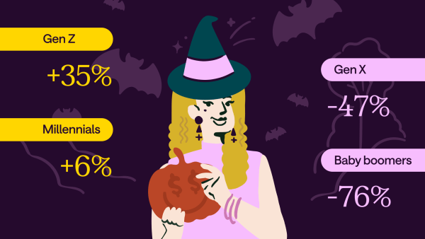 - Gen Z leads the way: In 2024, Gen Z Chime members spent 35% more on Halloween relative to the national average. Millennials were just about at the national average, while Gen X (-47%) and Baby Boomers (-76%) spent well below the national average. This potentially points to a generational shift in priorities, as those without kids are likely spending less on Halloween.