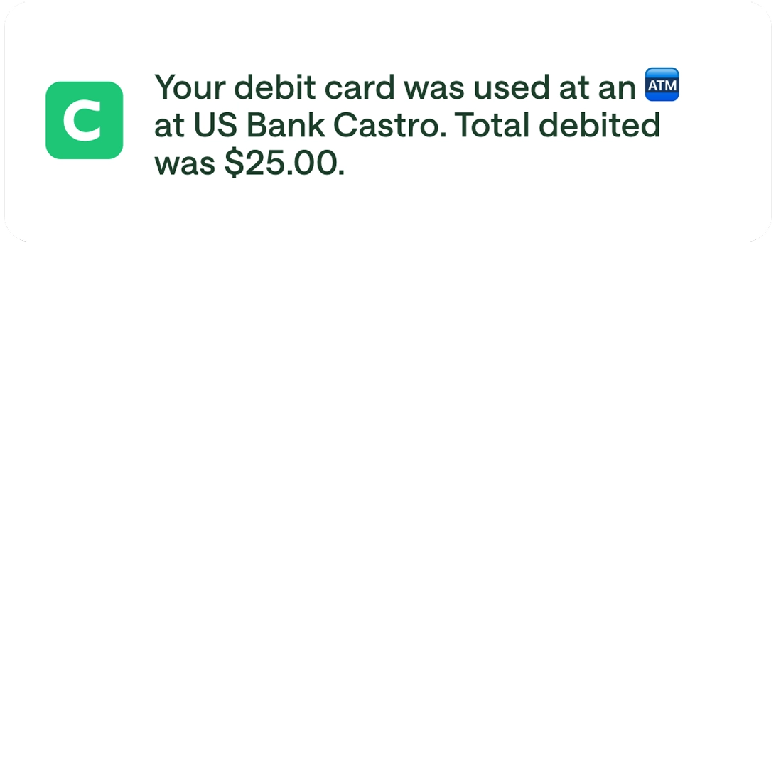 With Visa® Zero Liability Policy,5 your Chime cards are covered if they’re lost, stolen, or fraudulently used. Transaction alerts, custom card security features, and 24/7 customer support help you track every dollar.